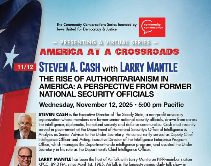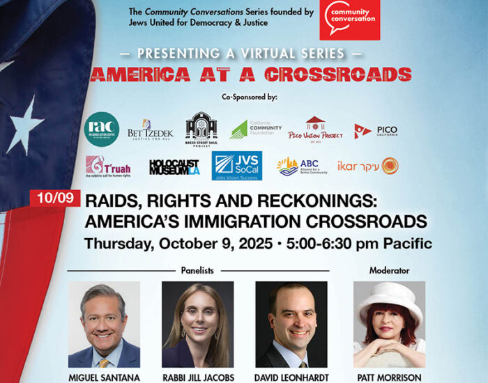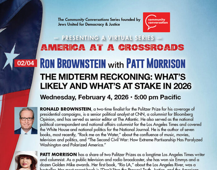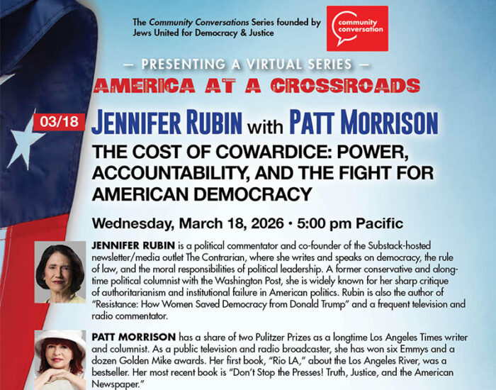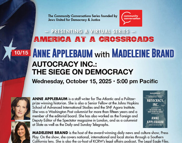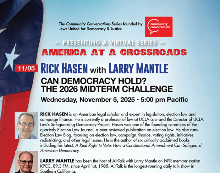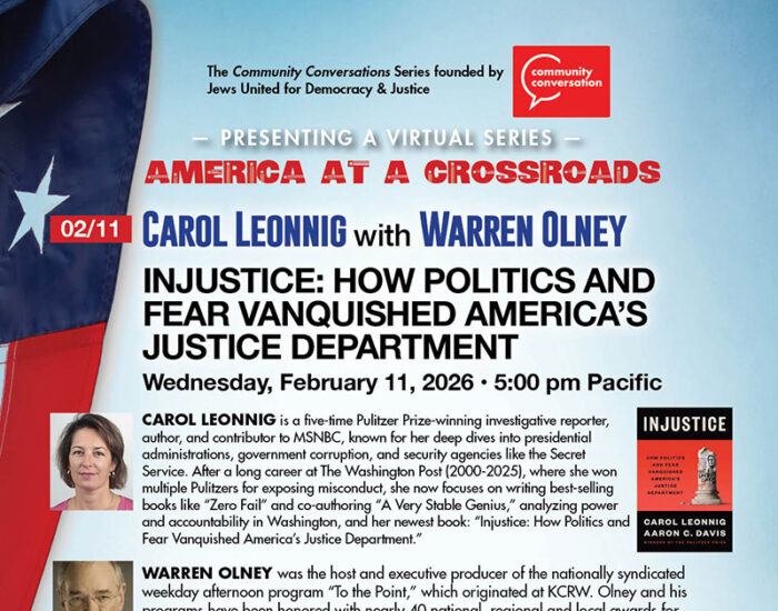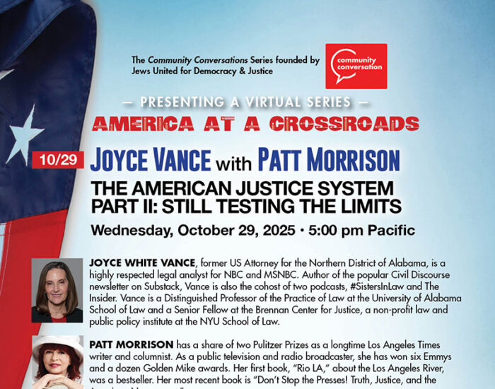 Jews United for Democracy and Justice is a nonpartisan collaboration of people of all faiths, or none, dedicated to combating authoritarianism and preserving democratic principles and justice in America.