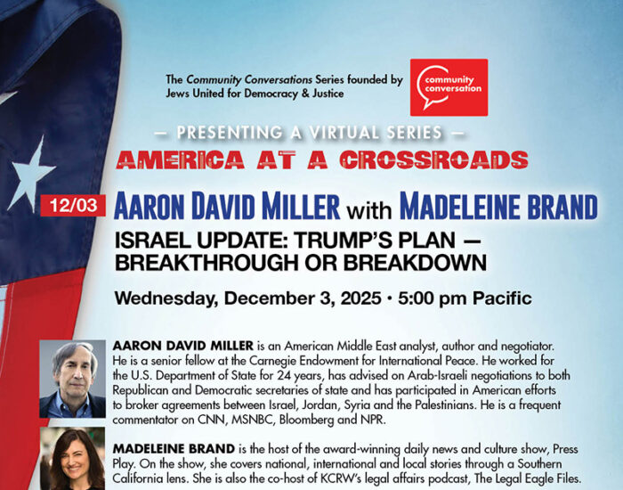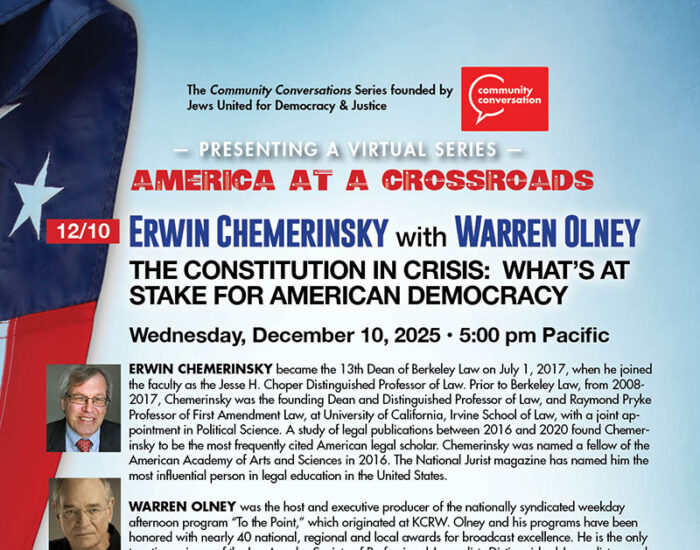 Jews United for Democracy and Justice is a nonpartisan collaboration of people of all faiths, or none, dedicated to combating authoritarianism and preserving democratic principles and justice in America.